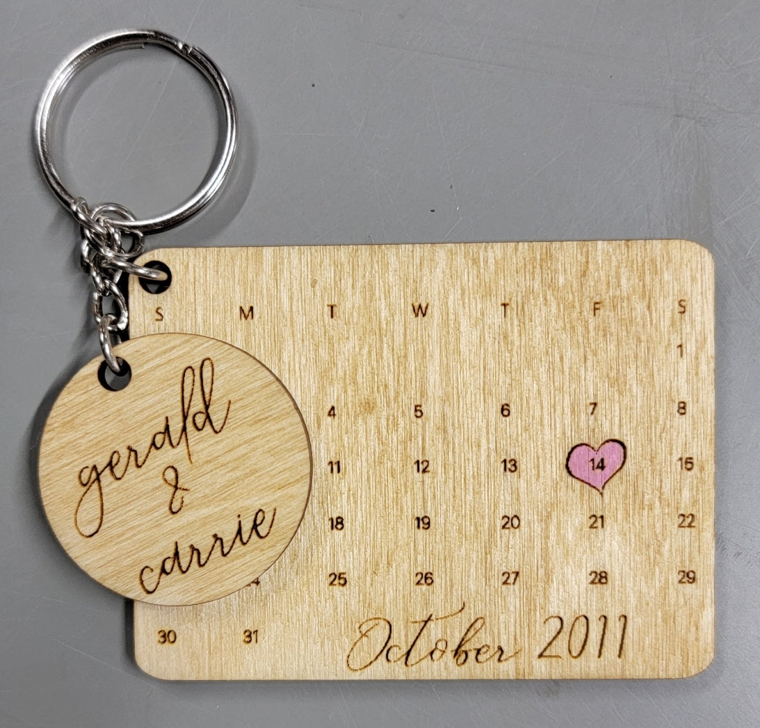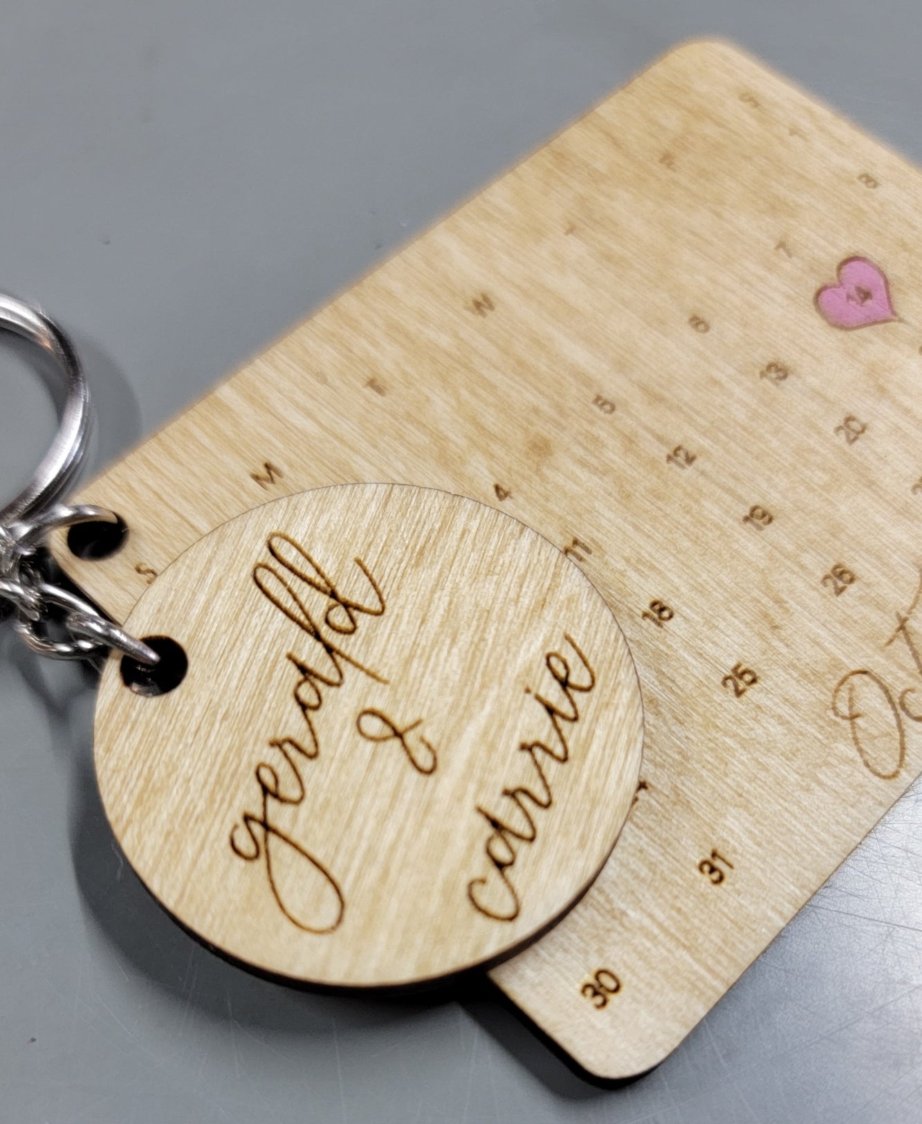 Engraved on ⅛" birch wood, this personalized keychain is stained a warm oak. Your special date is encircled by a hand drawn, engraved heart and painted a sweet pink.