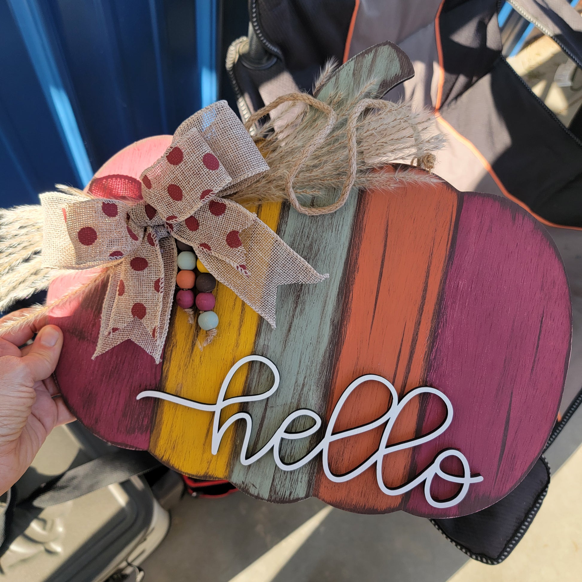 This Fall Shiplap Pumpkin Round is the perfect addition to your seasonal decor. Featuring shiplap detailing, a custom bow, and greenery accents, this pumpkin comes in multiple sizes and color schemes to fit your unique style. Add a touch of charm to your home with this beautifully crafted piece.