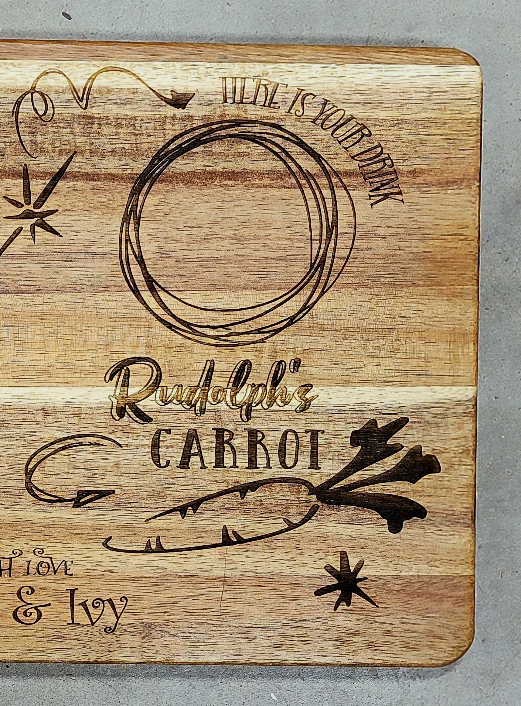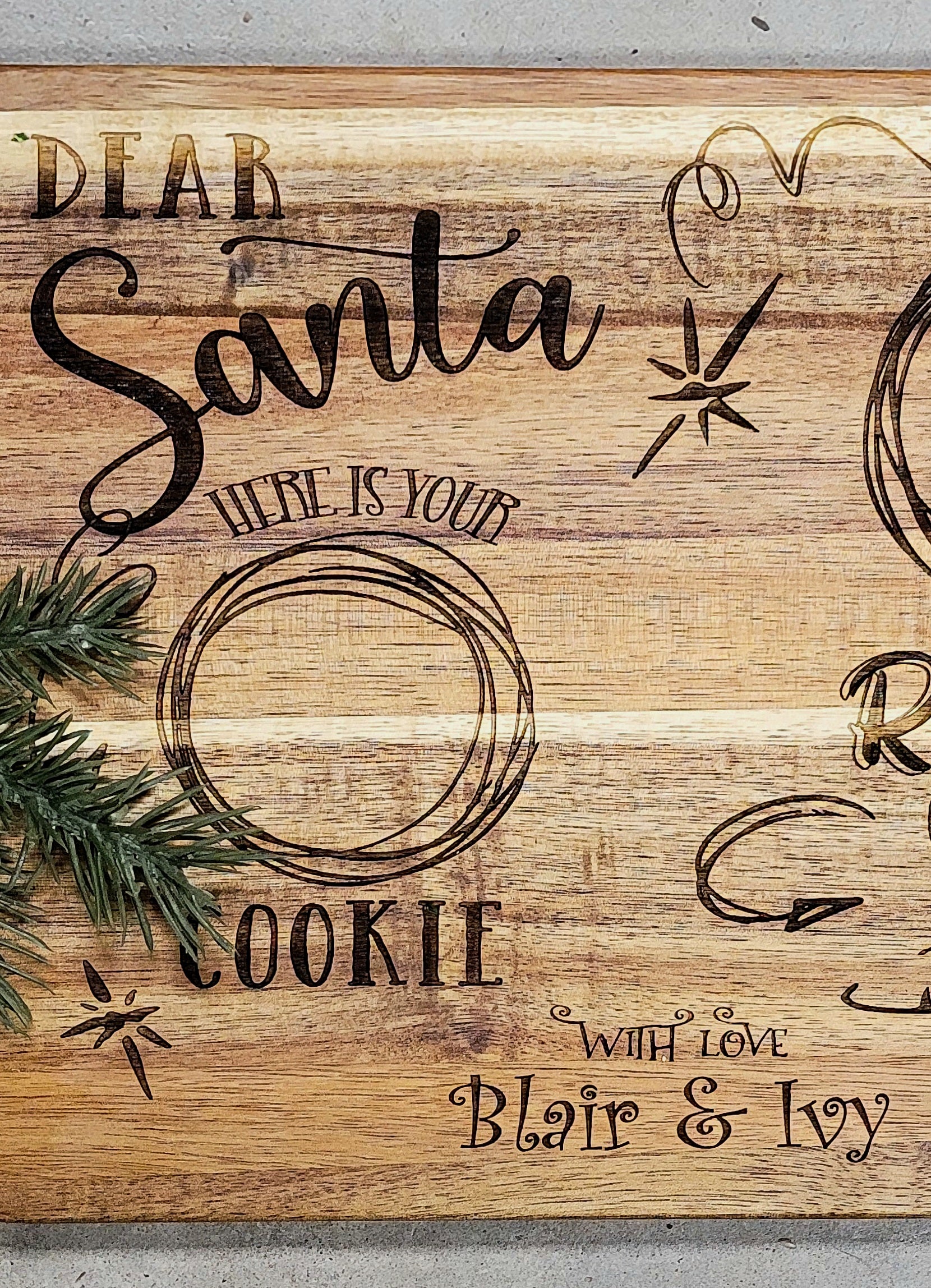 Elevate your Christmas traditions with our Santa Snack Tray! Made from beautiful acacia wood, it's the perfect way to leave Santa and his reindeer a delicious snack of cookies, milk, and carrots. Stay on Santa's nice list this year and make his night even sweeter. NOTE: SizeS is 16x9 inches; put name(s) in NOTES section in your cart before checkout.